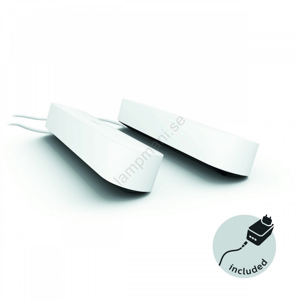 • Det utökade setet innehåller - 2x Hue Play med 2 m kabel, 1x strömadapter, 2x stativ, 2x klämma för TV, dubbelhäftande tejp och installationsmaterial.