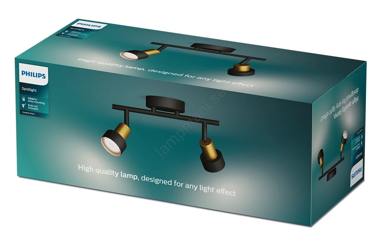 Philips - Spotlight CONDUIT 2xGU10/5W/230V svart/mässing kännetecknar snygg och funktionell design. En glödlampa med GU10 lock är lämplig för lampan. Här kan du köpa andra glödlampor till förmånliga priser. Du kommer att få ett intressant tillägg till ditt hem.