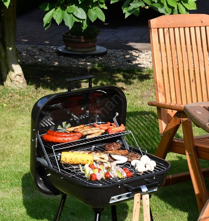 • Grillen är utrustad med justerbar ventilation och för själva tillagningen av dina delikatesser är den utrustad med ett galler tillsammans med ett förvaringsfack av förkromat stål.