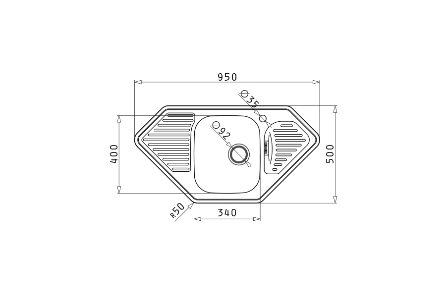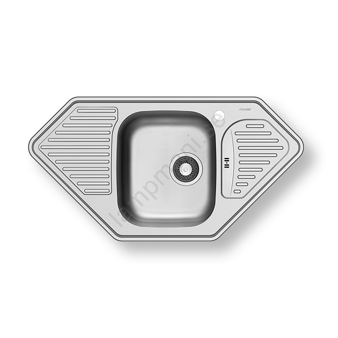 • Hörndiskho i rostfritt stål med ett hål för blandare och två avställningsytor.