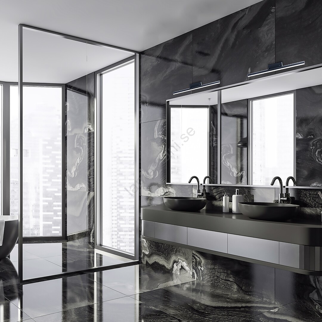 Det moderna badrumsbelysningsarmaturen Evan är ett utmärkt val för belysning över handfatet. Den mattsvarta armaturen, tillverkad av metall och aluminium, kompletteras med en vit plastskärm. Armaturen innehåller en inbyggd LED-ljuskälla med en effekt på 18W, ljusflöde på 1850 lumen och en livslängd på 20 000 timmar. Ljuskällan har en färgtemperatur på 4000 K och avger ett naturligt vitt ljus. Evan-armaturen har skyddsklass IP44, vilket garanterar skydd mot inträngning av föremål med en diameter på upp till 1 mm samt mot stänkande vatten från alla riktningar. Måtten för denna badrumsarmatur är: bredd 630 mm, höjd 75 mm, avstånd från vägg 100 mm. Vi erbjuder 5 års garanti på denna modell. Armaturen är lämplig för montering på alla typer av ytor.