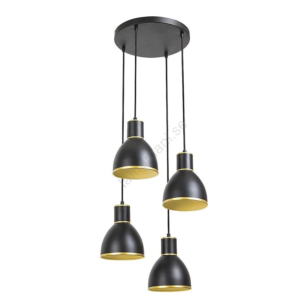Den fyrdelade taklampan Mackenzie i industriell stil är ett utmärkt val för många moderna vardagsrum eller till och med över matbordet. Vi rekommenderar den till alla som föredrar taklampor framför plafondlampor, men vill ha en lampa med ett enklare utseende istället för en prålig kristallkrona. Denna metallmodell är unik med sin svarta och gyllene färgkombination samt de fyra lampornas olika längder som bildar taklampan. Lampan kan användas med fyra ljuskällor upp till 60 W, med E27-sockel. För att skapa en mysigare och mer intim atmosfär, välj varmvita ljuskällor. Lampans mått är följande: diametern på den runda dekorativa basen är 280 mm och avståndet från lampa till tak är 1200 mm. Den fyrdelade taklampan Mackenzie levereras utan ljuskällor.