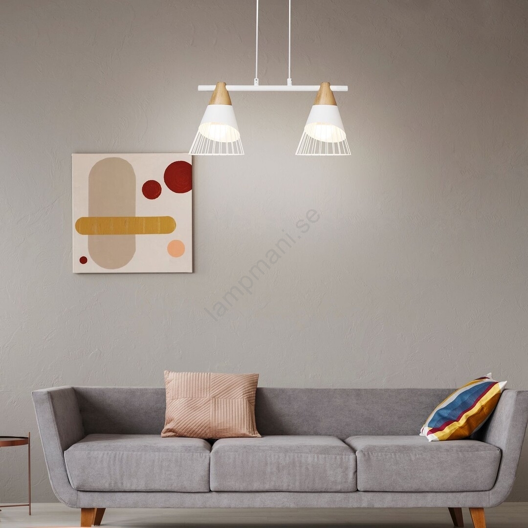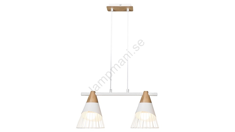 Dubbel taklampa Isaac blir ett fantastiskt tillskott till ditt moderna vardagsrum eller matsalsinredning. Denna modell i skandinavisk stil med sin kreativa design överträffar vanliga lampor. Lampan Isaac är tillverkad av metall och har en kombination av bokträ och vitt. Den koniska, gallerformade lampskärmen är täckt med ett snedställt, vitt yttre lager; spetsarna på konerna och den dekorativa basen kompletterar taklampan med ett naturligt bokträutseende. Dess mått är följande: lampan är 520 mm bred och avståndet från taket är 950 mm. Lampan Isaac kan användas med två ljuskällor upp till 60 W, sockeltyp: E27. Beroende på din smak kan du välja varmvitt eller naturligt vitt ljus. Dubbel taklampa Isaac levereras utan ljuskällor.