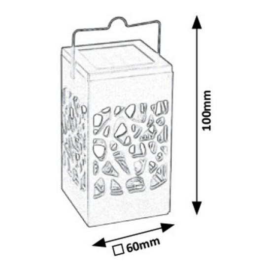 Solarlampan Mora blir en mycket mysig detalj på din veranda eller i trädgården. Du kan placera den på golvet, på bordet eller hänga upp den någonstans. Den svarta hängande dekorativa lampan är tillverkad av plast och dess inbyggda LED-ljuskälla avger ett varmt vitt ljus. Den energisnåla ljuskällan har en effekt på 0,07 W, en ljusstyrka på 1,2 lumen, en färgtemperatur på 3000 K och en livslängd på 20 000 timmar. Specifikationer för solceller: AAA NiMH 200 mAh. Höjden på den fyrkantiga yttre dekorativa lampan med måtten 60x60 mm är 100 mm. Den har IP23-klassning, vilket innebär skydd mot intrång av föremål med en maximal diameter på 12 mm (t.ex. fingrar) och skydd mot regnvatten som faller i en vinkel upp till 60°.