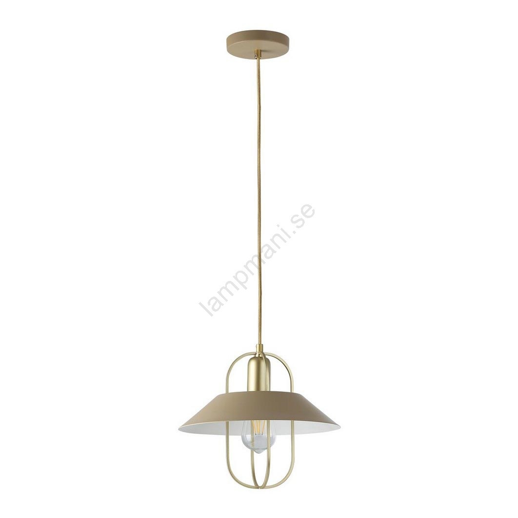 Den industriella taklampan Nesrin blir en karaktäristisk detalj i ditt moderna vardagsrum, matsal eller sovrum. Denna helt metalliska modell i guldton kompletteras med en beige skärm i hattstil och kan monteras i taket med en rund dekorativ bas. Kabeln är tillverkad av textil. Den fristående ljuskällan och den markanta skärmen ger lampan en särskild stilfull karaktär. Nesrin-lampan kan användas med en glödlampa på upp till 40W. Sockeltypen är E27. För att skapa en intim och mysig atmosfär rekommenderas en varmvit ljuskälla till denna lampa. Måtten på taklampan Nesrin är följande: skärmens diameter är 300 mm, avståndet från taket är 1800 mm, installationsdiametern är 120 mm. Denna modell levereras utan ljuskälla.