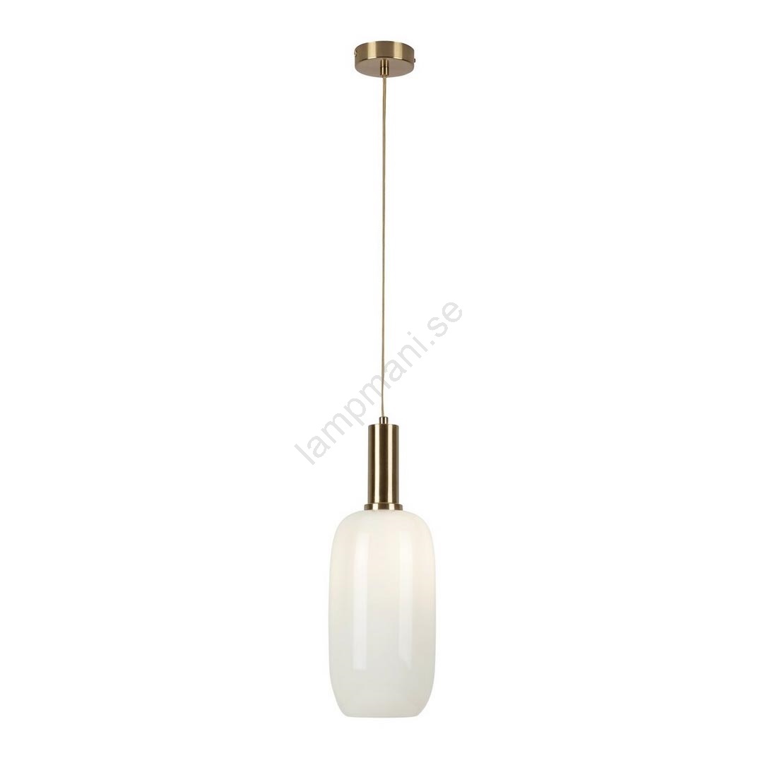 Den klassiska taklampan Sinopia blir en diskret och elegant detalj i ditt vardagsrum eller sovrum. Den gyllene armaturen kompletteras av en opalglas-skärm och kan monteras i taket med en liten rund dekorativ platta. Den avlånga skärmen i flaskform är kopplad till den dekorativa basen med en textilkabel. Denna taklampa är avsedd för en glödlampa med upp till 60W effekt. Sockeltypen är E27. För att skapa en intim och mysig atmosfär i rummet rekommenderas en varmvit ljuskälla till denna lampa. Måtten på taklampan Sinopia är följande: skärmens diameter är 145 mm, dess höjd är 285 mm, avståndet från taket är 1500 mm och installationsdiametern är 90 mm. Denna modell levereras utan ljuskälla.