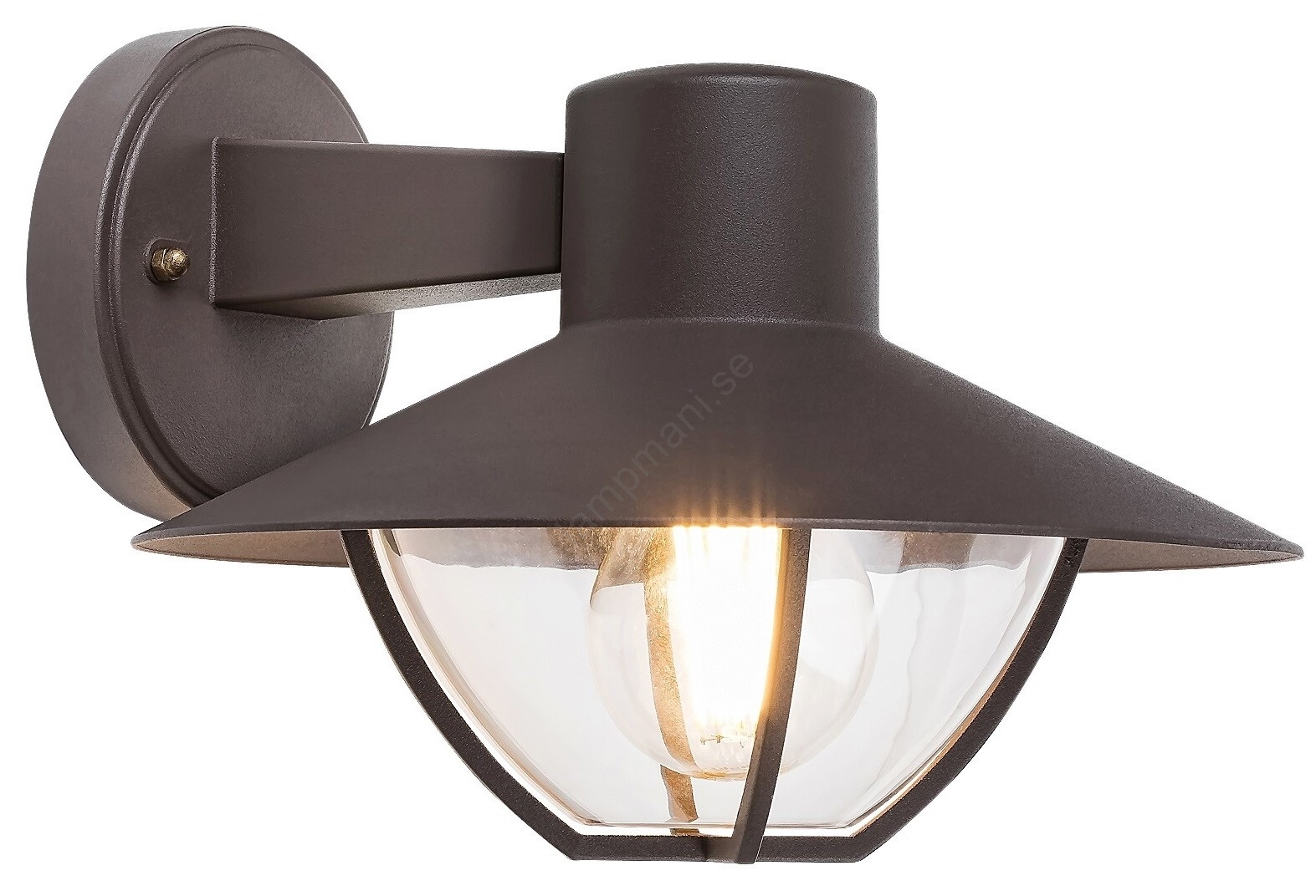 Utomhusvägglampan Almada representerar en traditionell stil. Den bruna aluminiumarmaturen kompletteras med en klar plastskärm och lampan kan monteras på väggen med en rund dekorativ bas i samma färg som armaturhuvudet. Denna modell kännetecknas av en hattformad kropp med ett brett spann och en skärm i form av en båt. Almada-lampan är ett stilfullt val för terrassen, men kan även installeras vid ytterdörren. Vägglampan kan användas med en ljuskälla upp till 10 W, med E27-sockel. IP44-klassningen garanterar skydd mot intrång av föremål med en diameter på upp till 1 mm samt mot stänkande vatten från alla håll. Måtten på Almada-utomhuslampan är följande: bredd 240 mm, höjd 180 mm, avstånd från väggen 270 mm. Lampan levereras utan ljuskälla.