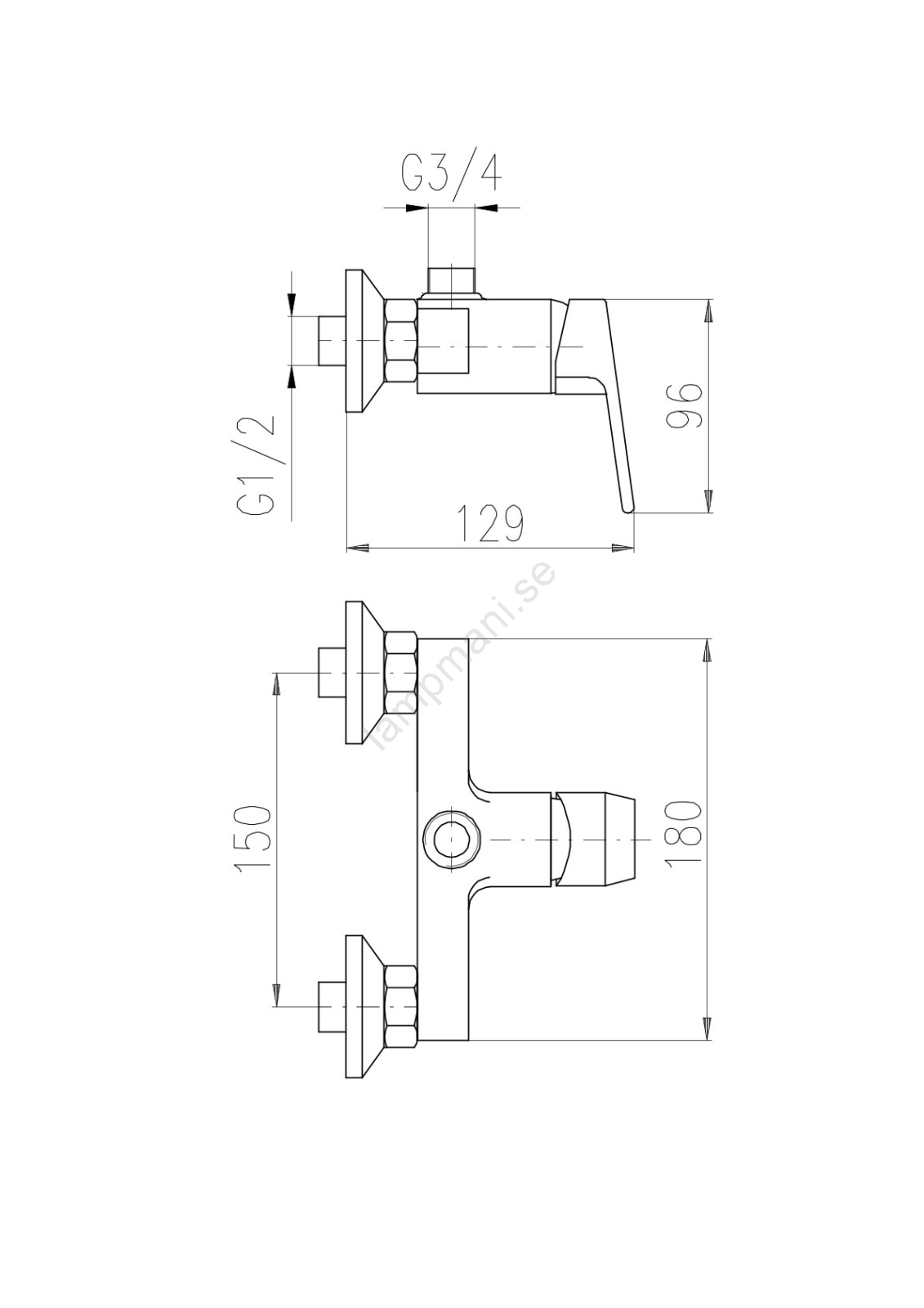 • Väggmonterad duschblandare med övre 3/4" anslutning för duschstång.
