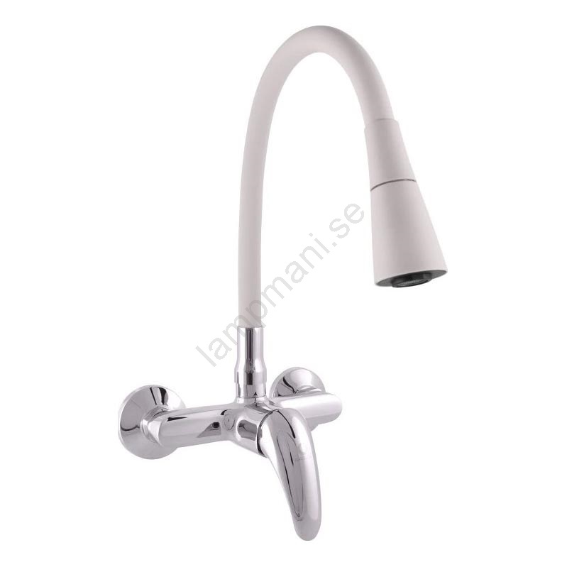 • Väggmonterad blandare för diskbänk med flexibelt svängbart utslagsrör och handdusch.