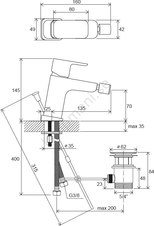 • Blandaren levereras med dragstyrd bottenventil och avloppssats.