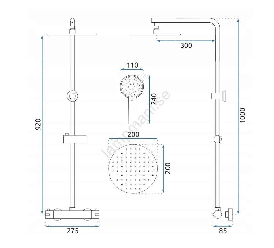 • Förpackningen innehåller: termostatblandare, handdusch och huvuddusch, hållare, 150 cm slang.