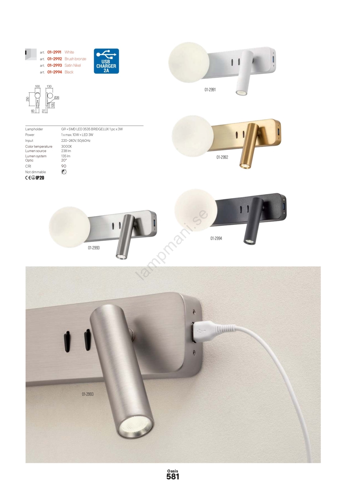 • Redo 01-2991 - LED vägglampa OASIS LED/3W/230V + 1xG9/10W USB CRI 90 vit