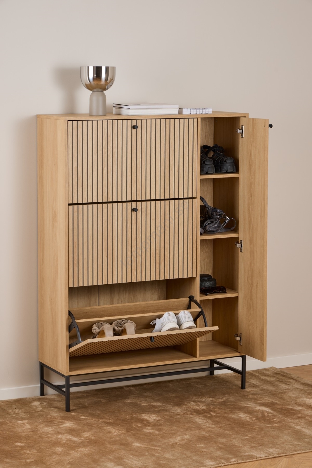 • Med 3 fack och 3 hyllor utnyttjar den ditt utrymme och förvarar dina skor diskret utom synhåll.