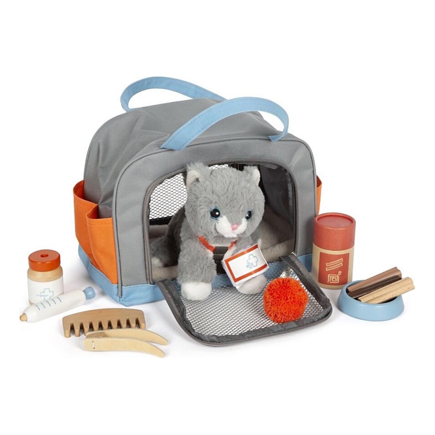 • Setet innehåller: en mjuk katt, transportväska med underlägg, matskål, godisburk, pincett, bandage, medicinlåda, leksak, borste och en spruta med fjädermekanism.