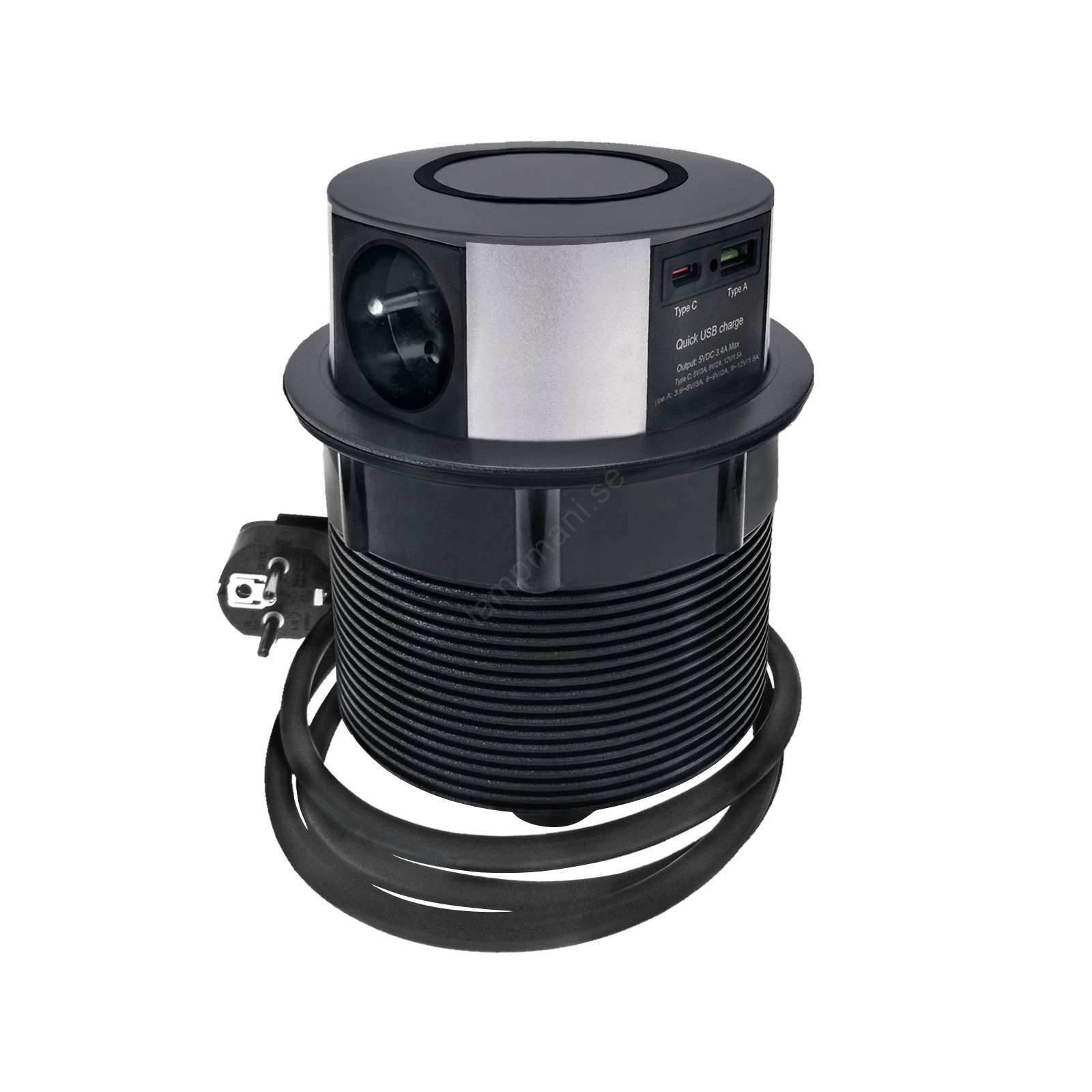 Infälld elstolpe för bordsskiva med trådlös Qi-laddning 3x230V + 1xUSB-A + 1xUSB-C svart/silver