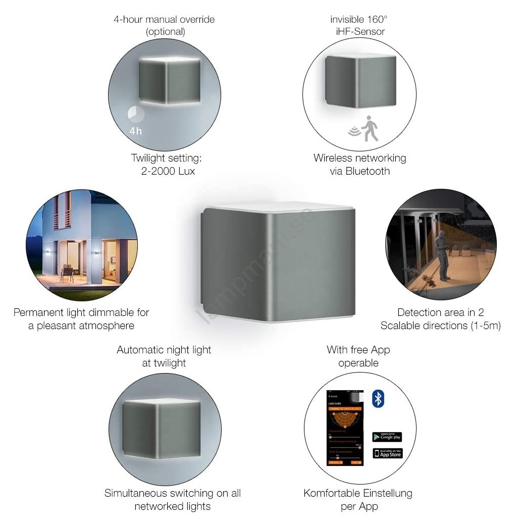 • Lampan styrs via den kostnadsfria appen STEINEL SmartRemote (kompatibel med Android och iOS) och Bluetooth.