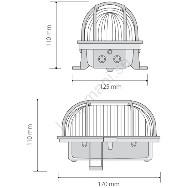 • En monterad vägg- eller taklampa med klart skyddsglas och plastskyddsgaller.