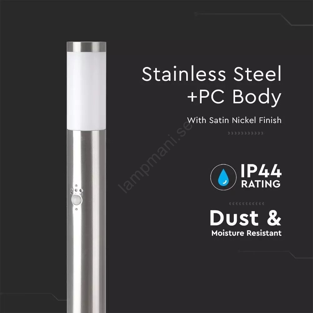 • Utomhuslampa med rörelsesensor, tillverkad i rostfritt stål.