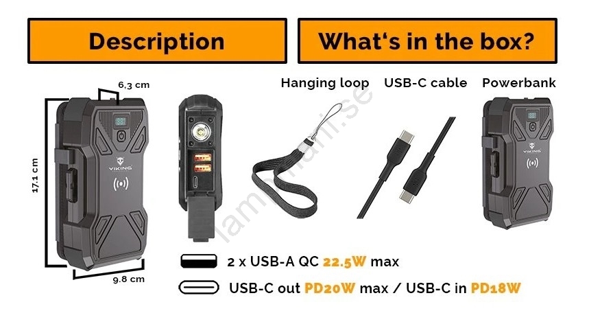 • Powerbanken är utrustad med ett högkvalitativt Li-Polymerbatteri som säkerställer att dina enheter laddas säkert och pålitligt.