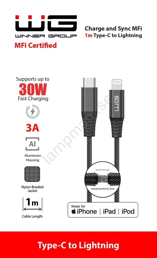 Winner Group - USB-kabel MFI Lightning/USB-C 1m svart | Lampmani