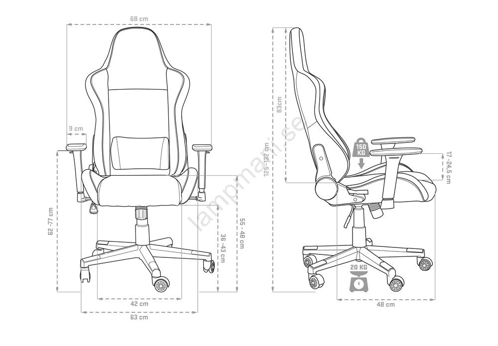 • Den kompletta basen, inklusive stålramsstruktur, hjul och gaslyft med säkerhetsklass 4, är designad för maximal belastning upp till 150 kg.