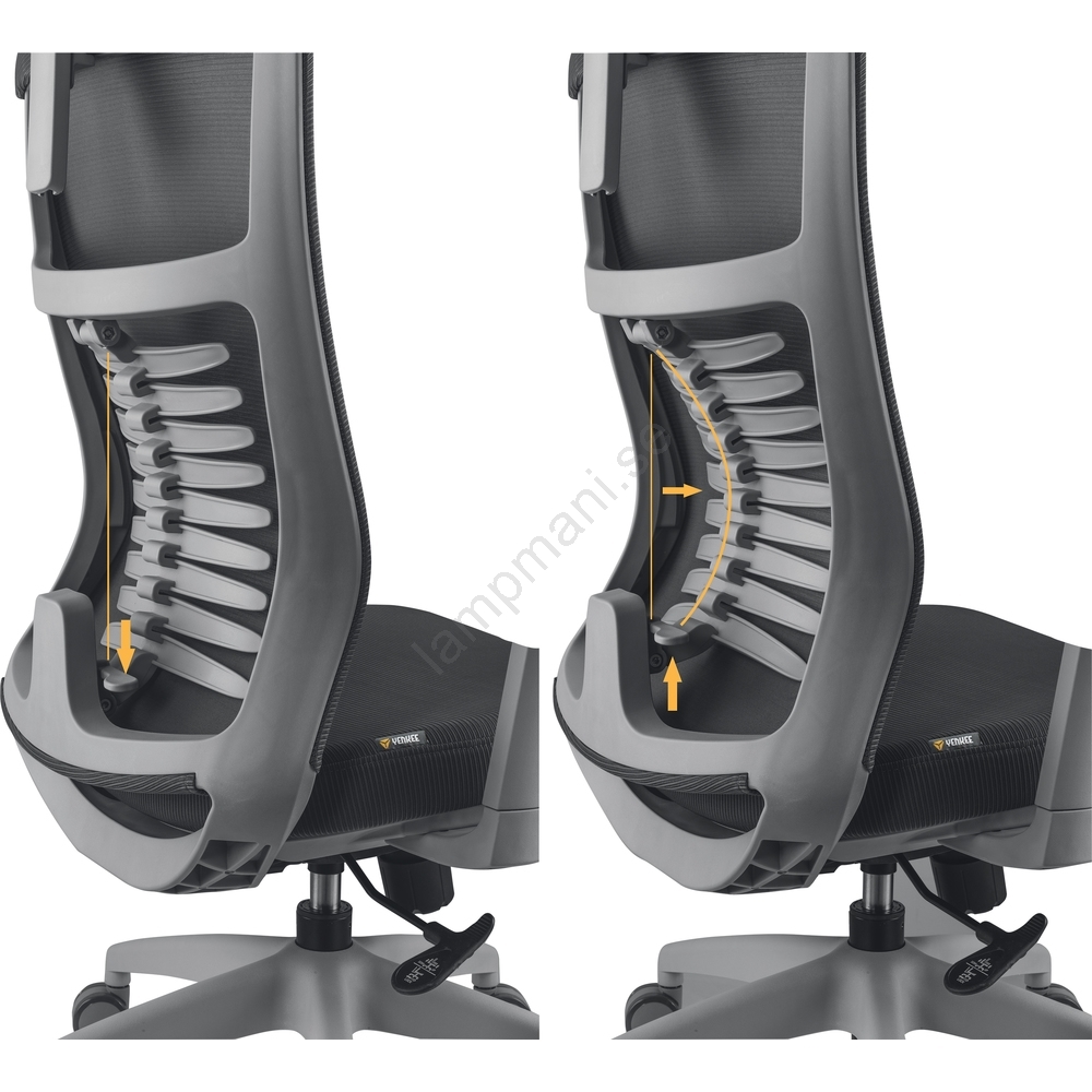 • Ländryggsstödet är klätt med mesh-tyg, vilket ökar luftgenomströmningen och förhindrar överhettning och svettning i kroppens kontaktpunkter.
